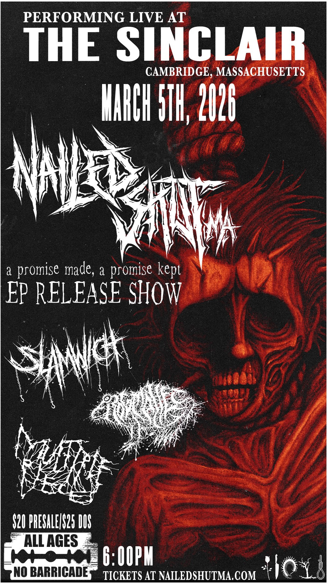 Nailed Shut MA have performed in many iconic venues across the northeast as well as 2024 Inkcarceration Festival. Bands they have shared the stage with include All Shall Perish, Peeling Flesh, Power Trip, Kaonashi, End It, Gatecreeper, and many more. Their energetic performances are sure to knock the wind out of you. With much more new music and many more shows planned for the coming months, Nailed Shut MA are here to wreak havoc in 2026 and beyond.