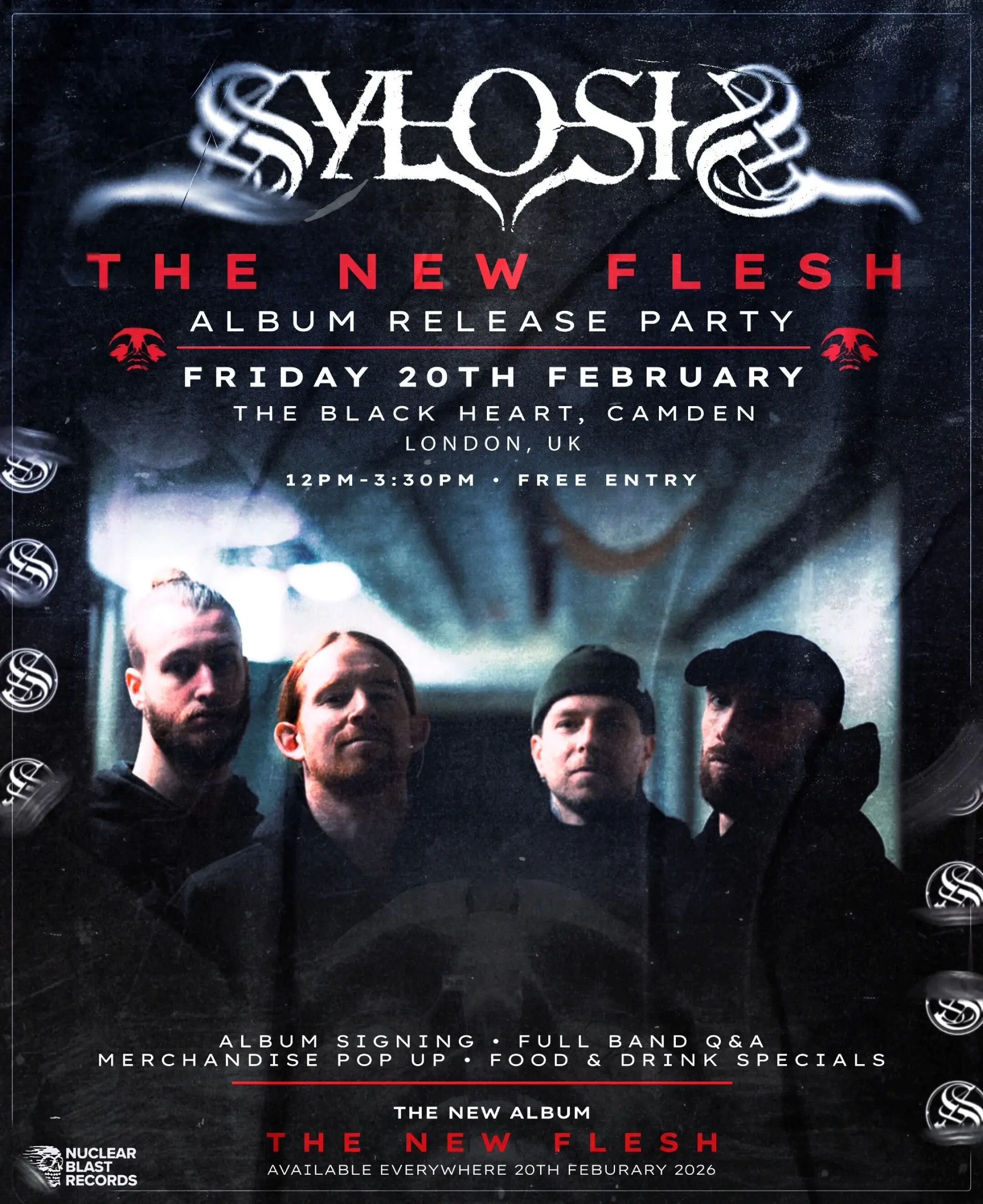 SYLOSIS will also be hosting an ‘Album Release Party Event‘ on February 20th from 12-3.30pm, at The Black Heart, Camden. The free-entry event will include an album signing session, a full-band Q&A, a merch pop-up, and food and drink specials. See flyer below for more info!