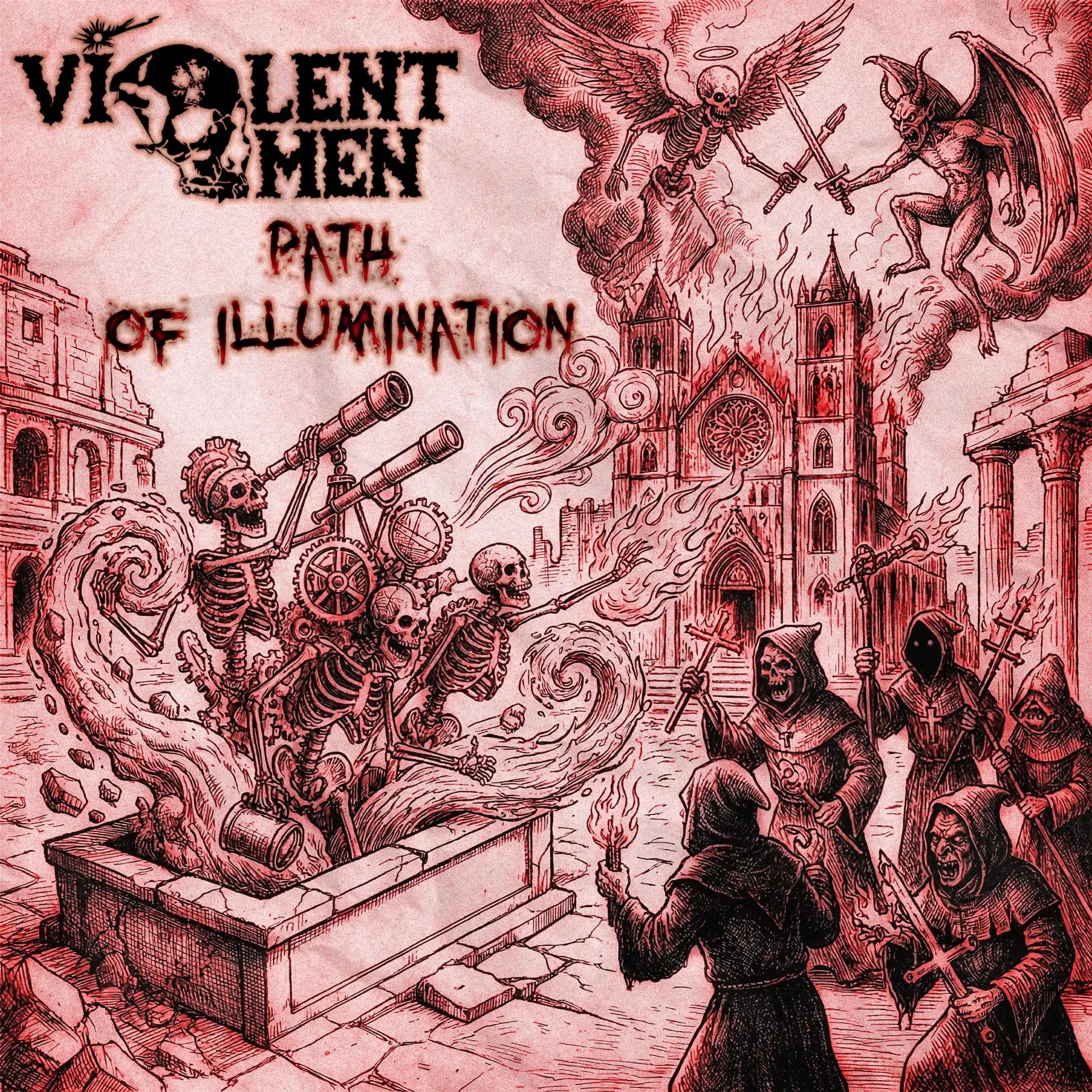 In 2009, the first demos were recorded with former Lucifugum vocalist Faunus, and in 2010, the band’s debut album Infernal Express was released. Just as it was released, drummer Yuriy Sinitsky (ex-Drudkh, ex-Blood of Kingu, ex-Lucifugum, Lyutomysl, Tria Prima, ex-All Dies, ex-Definition Sane), with whom the band even presented the album at one of their concerts in Kyiv. After the arrival of such a professional drummer, the band began to sharply change course towards technical thrash, complicating their music. In 2011, they released their second album, Lunatic’s Revenge, on which the band revealed themselves to the fullest and proved themselves to be worthy competitors to the American band Vektor. After the album’s release, the band played numerous concerts and festivals in Ukraine, as well as several times in neighbouring countries, sharing the stage with Artillery, Dying Fetus, Morgoth, and others. Thanks to this, the band became known as a young and promising group. In 2013, the band released their third and best and most successful album, entitled L.U.N.A.C.Y., which was released on the American label Razed Soul. Many well-known musicians also participated in this album, such as John Gallagher (Raven), André Grieder (Poltergiest, ex-Destruction), V.O. Pulver (Poltergeist, Carrion, Messiah, Panzer), Don Doty (ex-Dark Angel), Jim Durkin (R.I.P. 2023 (ex-Dark Angel)), and Josh Christian (Toxik). The album receives rave reviews from the press and fans. After opening for Artillery in the spring of 2014, founder and bass guitarist Serg MP controversially leaves the band due to personal differences, immediately forming his new band, Bestial Invasion. The remaining members of Violent Omen took on a new bass guitarist and played a few more concerts, releasing a couple of songs and a demo in a different style for the band, after which the band went inactive a couple of years later without releasing a single new album since 2013. Ten years later, in the spring of 2024, Serg MP accidentally meets drummer Yuri, whom he had not seen for almost ten years and with whom he had unresolved conflicts, and they settle their misunderstandings and, on friendly terms, create a new death metal band, Tria Prima. After six months of intense rehearsals with the new band, Serg MP and Yuri came up with the idea of reuniting Violent Omen and recording a new album to correct the mistakes of the past and give fans new music. Since Floods no longer wanted to be involved, it was decided to bring in a new professional guitarist, Evgeny Maestro, with whom Serg MP had played for a long time in Bestial Invasion, Cosmic Jaguar, and Tria Prima. Serg MP took over the microphone stand, combining it with bass guitar, thus keeping the band as a trio. The songs and material for Serg MP’s solo album, which he was working on with Evgeny Maestro at the time, were taken as the basis for the new album Violent Omen. In 2025, the band recorded seven songs for the new album. In 2025, the band recorded seven songs for a new album entitled Locomotive of Chaos, which will be released in spring 2026 on the Ukrainian label Nocturnus Records.