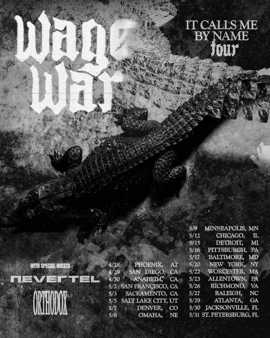 Wage War will waste no time bringing these leviathan-sized new songs to fans, as the band will return to the road this spring on the “It Calls Me By Name Tour,” featuring support from Nevertel and Orthodox. The tour kicks off on April 28 in Phoenix and runs through May 31 in St. Petersburg, Florida. All dates are below. Get tickets here.